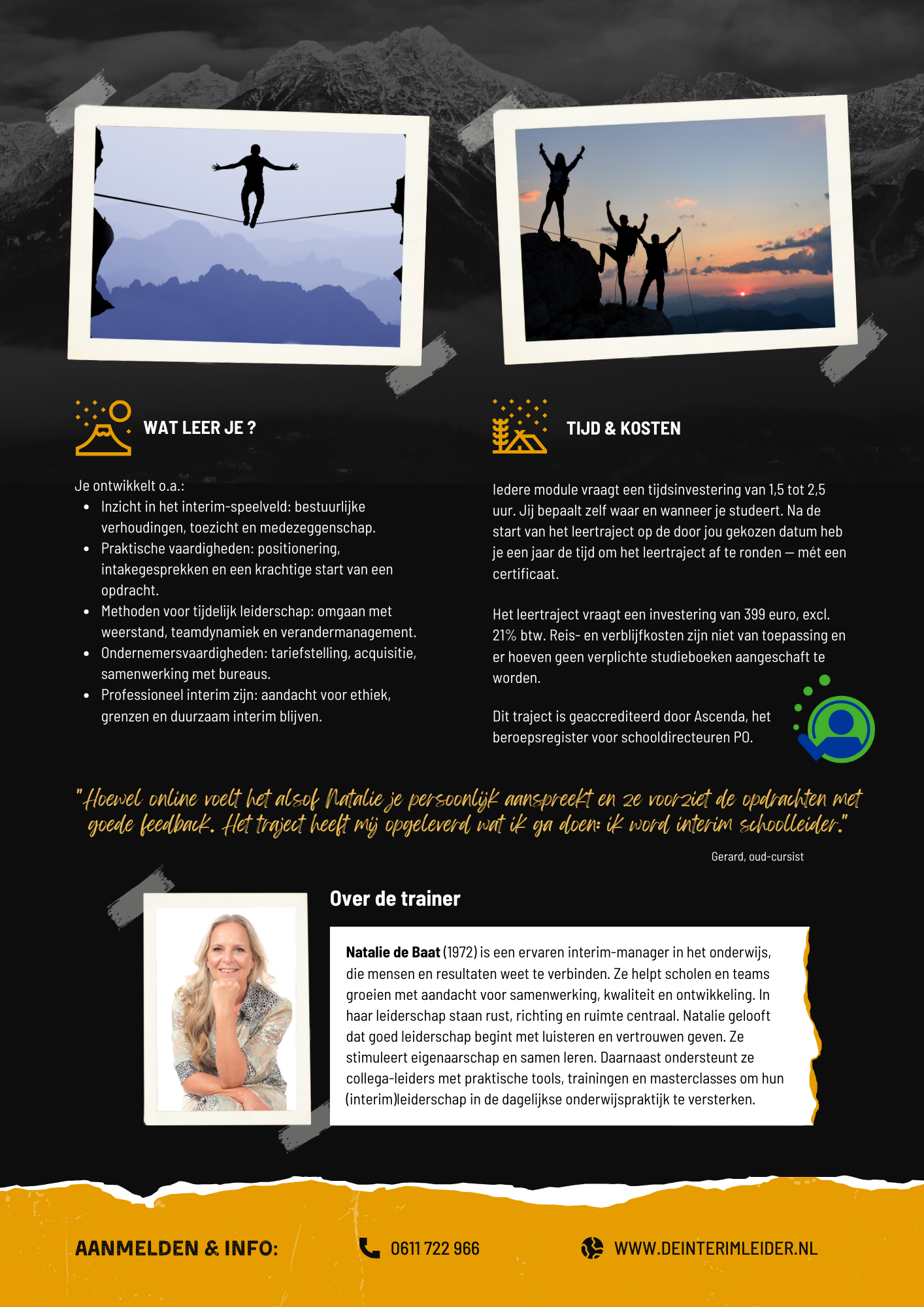 Wil je meer weten over het werken als interim-leider in het onderwijs of ben net gestart en wil je stevig aan de slag? Zoek je meer zelfvertrouwen, impact en een slimme aanpak? Of wil je gewoon weten wat nodig is om de stap naar zelfstandig ondernemen te zetten?