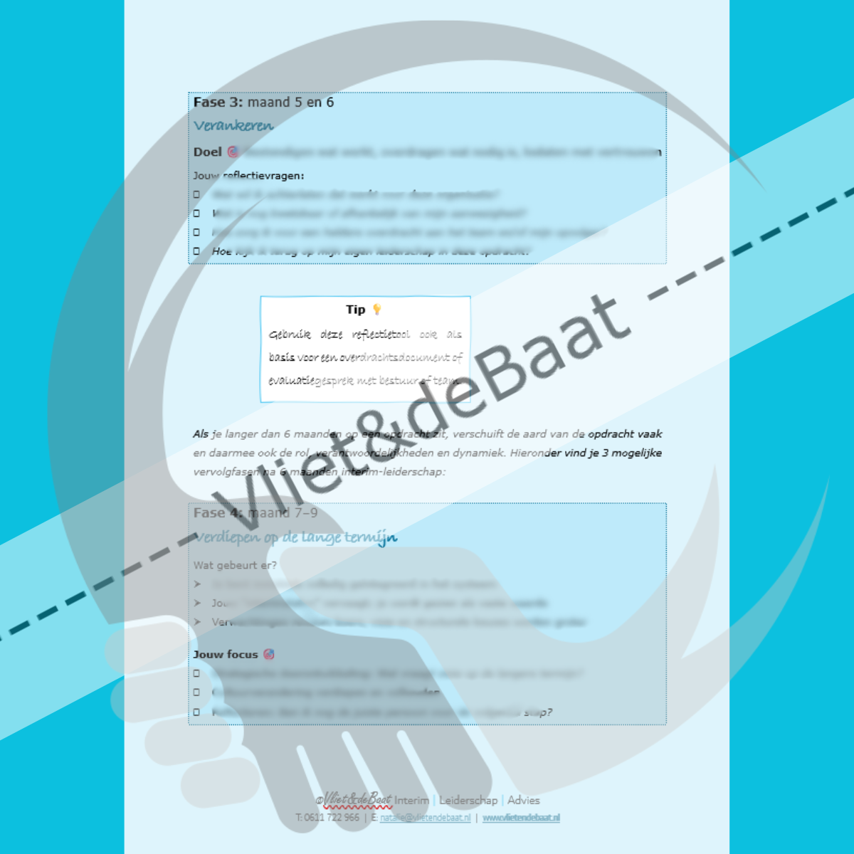 Het Interim-Impact-Plan helpt je om je opdracht doelgericht en met impact te doorlopen. Het plan is verdeeld in 3 fasen en elke fase bevat gerichte reflectievragen die je kunt gebruiken als leidraad in je werk, maar ook als input voor de tussentijdse gesprekken met je opdrachtgever.