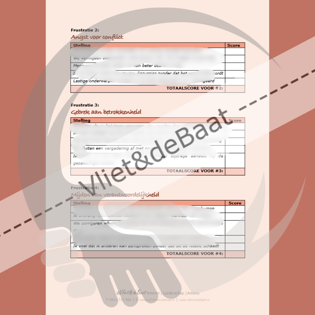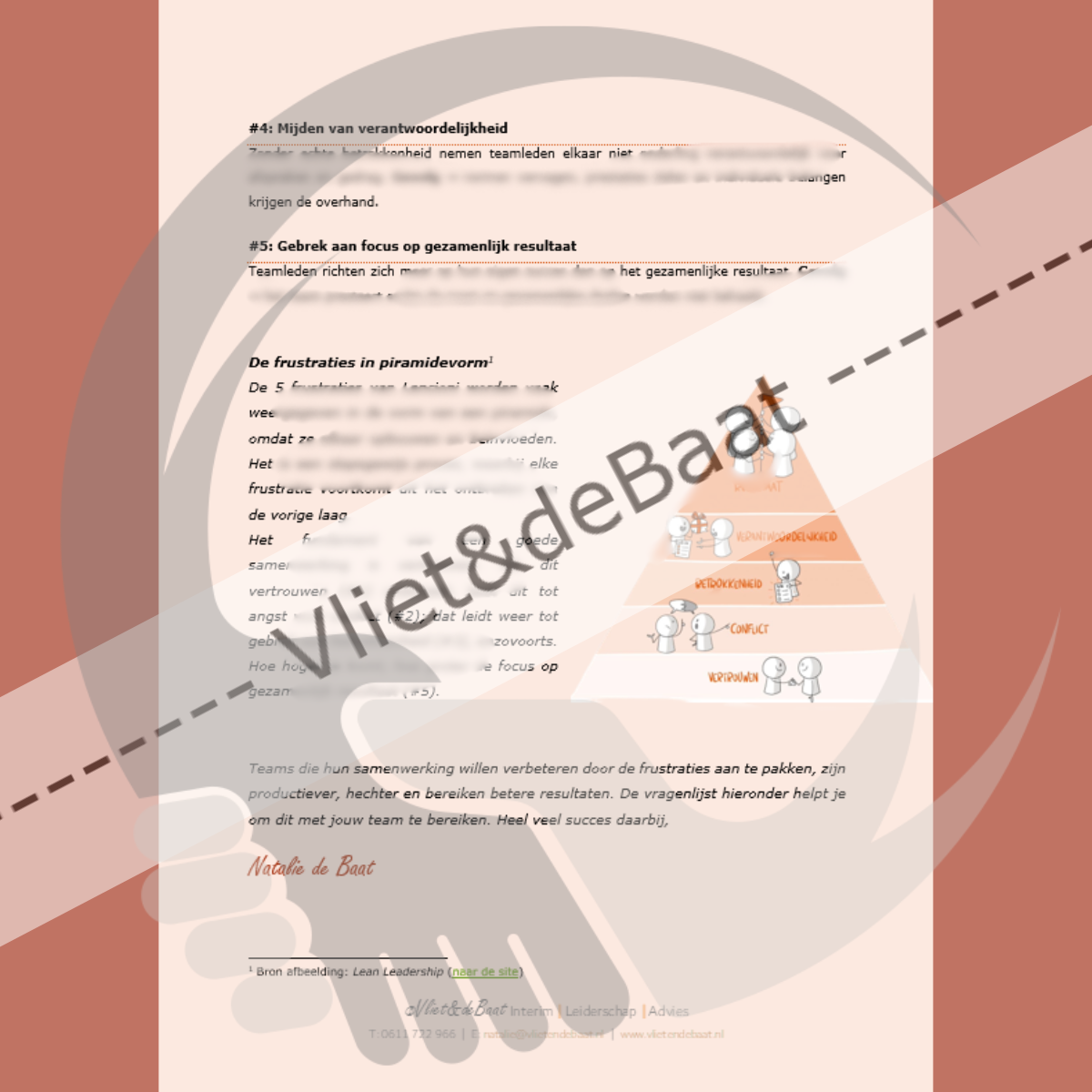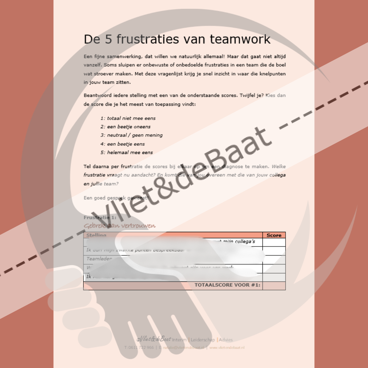 Samenwerken in een team is mooi, maar soms ook frustrerend. Denk aan ingeslikte meningen, afspraken die verwateren of het gevoel dat je niet echt samen resultaten behaalt. Met deze Teamcheck onderzoek je met je team of en welke hoe frustraties in jullie team leven, zodat je die samen om kunt zetten naar kracht.